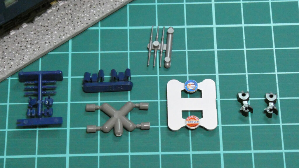 左から、信号炎管(上の6本です。下にある4個のパーツは使用しません)・青いホイッスルカバー、グレーの避雷器、ニギリ棒、ヘッドマーク(「ミステリーリレー号」と「さよなら66」)、ナックルカプラーです。