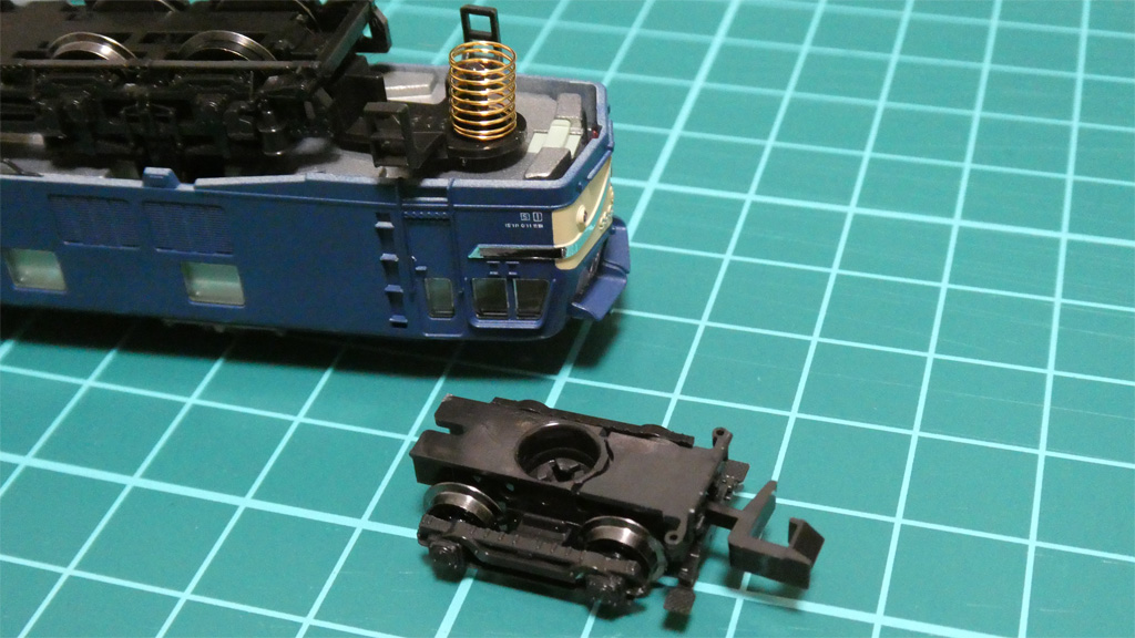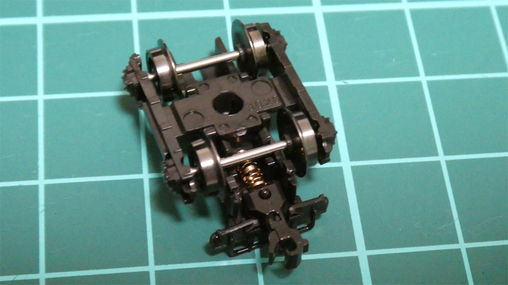 台車の軸が付いている板(スプリングを乗っけているところ)と先台車の間をこじる様な感じで外すのがやりやすいですかね。間違ってるかもしれませんけど。。