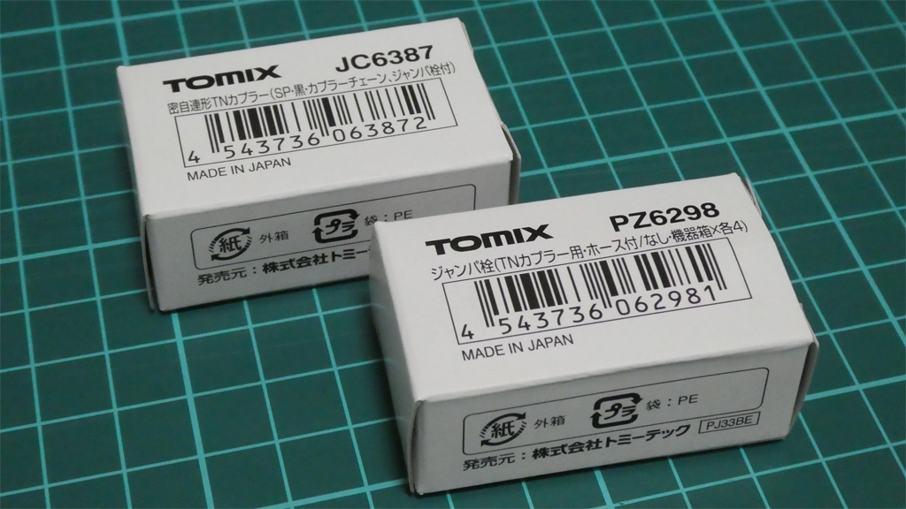 JC6387 密自連形TNカプラー(SP・黒・カプラーチェーン、ジャンパ栓付)と、PZ6298 ジャンパ栓(TNカプラー用・ホース付/なし・機器箱×各4) です。