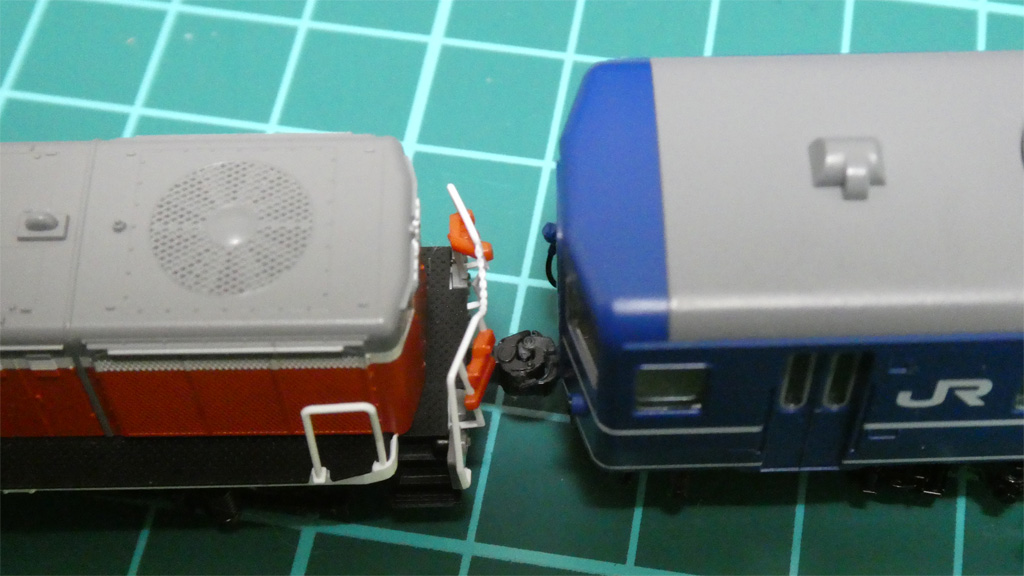 それはともかく、KATOのナックルカプラーをTOMIXのTNカプラーに連結できるように加工したのは、貨車連結側としていたキャブ側だけなんですよね。