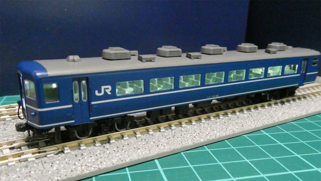 実際にはスハネフ14との連結ですが、カプラー交換やジャンパ栓取り付け、室内灯取り付けなどでオハフ15が手近なところにあったので、代用です。