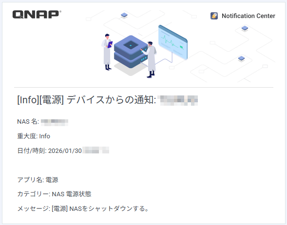 同じネットワーク内からNASが見えない、pingも通らない、そんな状況の下で強制的に電源をOFF/ONしたときのイベントが、ほぼリアルタイムで「通知センター」からメールで通知されていたんです。