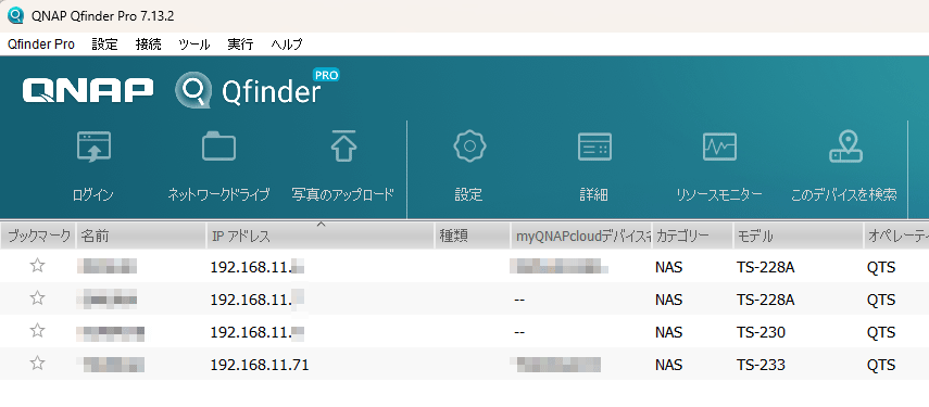 Wi-Fiルーターから振られたDHCPのアドレスで起動しました。もちろん、Qfinder Proで見えます。