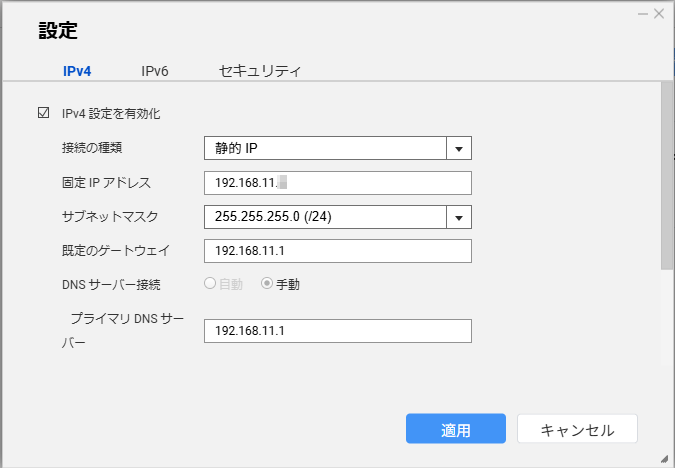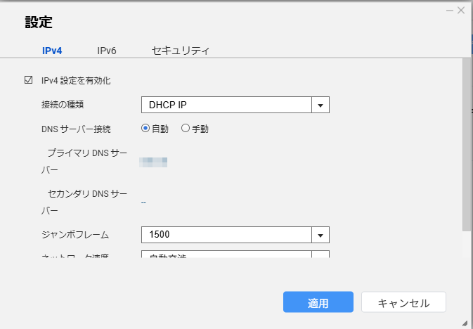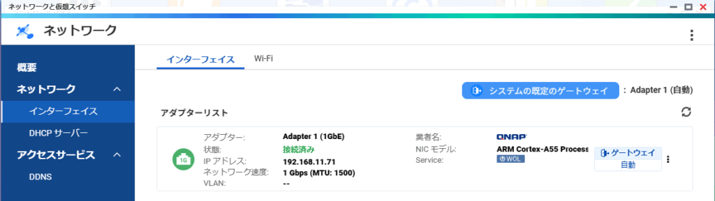 さすがに、固定IPを前提に、ネットワーク内でいろいろな設定を行っているので、DHCPのアドレスでは問題が多々ありますので、真っ先に変更します。