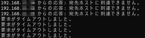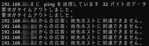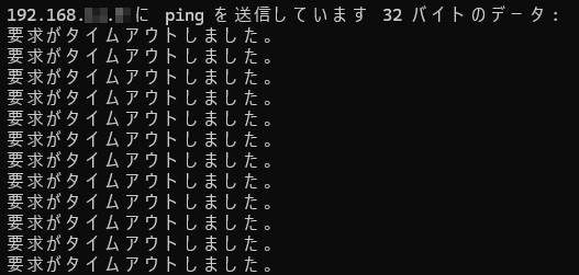 あれ?と思って、コマンドプロンプトからpingを打つと、延々と