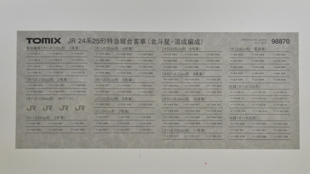これらの車番の他に、オハネフ24 500用にJRマークが用意されています。501にはJRマークがありますが、502はありませんので、501を選択する場合には、JRマークを転写する、ということですね。