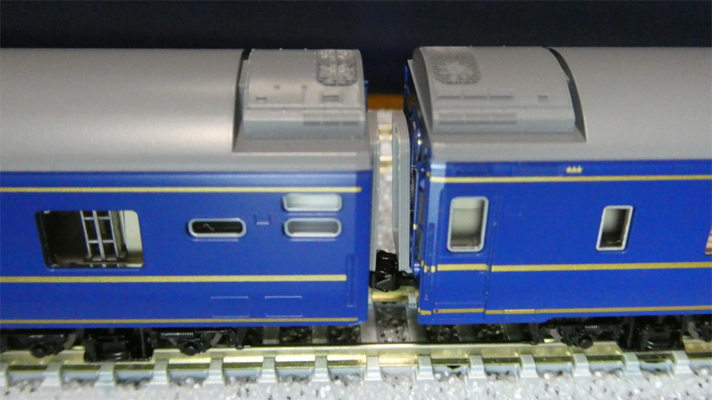 右の車両がオハネフ24-502です。幌とTNカプラー化で、いい感じに縮まったかと思います。