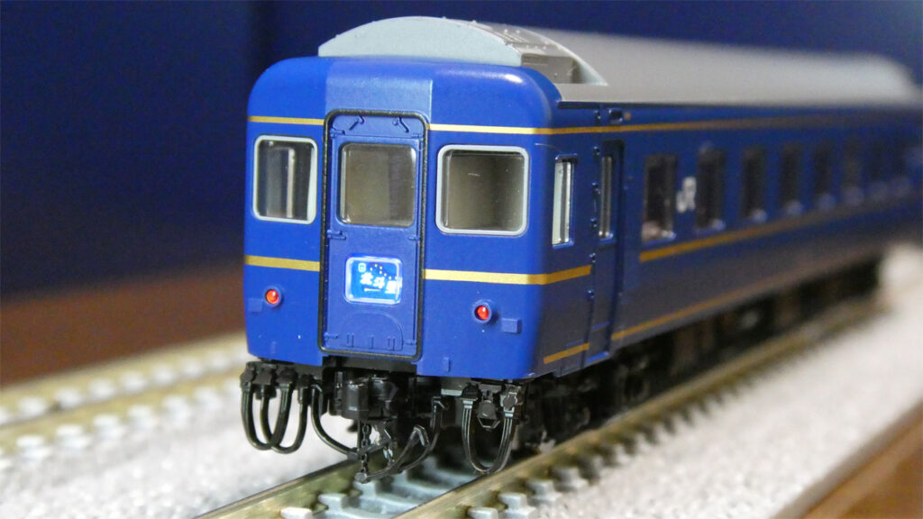 1号車のオハネフ25-0は、実車では4人用コンパートメントでしたが、模型では通路とベッドの間にある壁やドアはなく、通常の開放B寝台と同じ形ですね。これはTOMIXの公式サイトにも特記事項として記載されています。