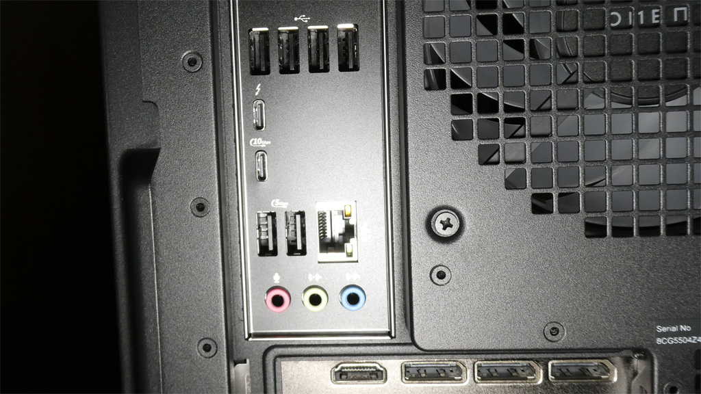 背面は、Thunderbolt 4 対応のUSB Type-C 40Gbpsが1つと、Type-C 10Gbpsが1つに、Type-A 5Gbpsが2つ、USB 2.0 の Type-Aが4つあります。GPUには HDMI2.1が1つ、DisplayPort2.1aが3つあります。それと、ライン出力、ライン入力、マイク入力が1つずつ、ですね。