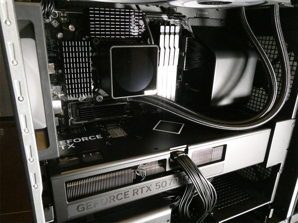 3スロット相当のRTX 5070 Tiの存在感がすごいです。もちろん、水冷クーラーからの内部を巡るパイプも威容が漂ってますけどね。