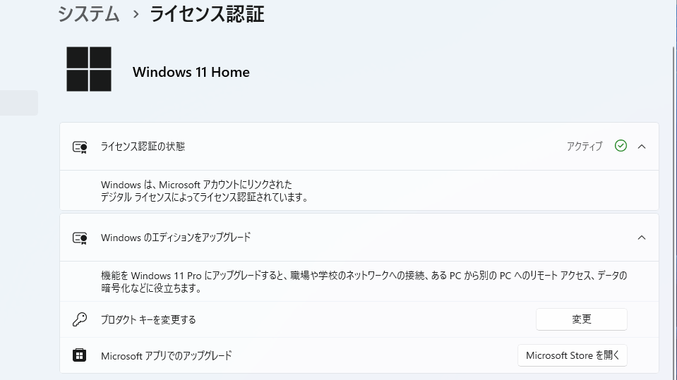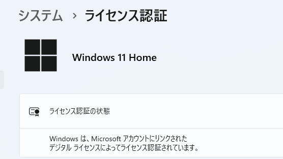 通常、セットアップが終わっているということは、そのPCとWindowsのライセンスが紐づいているはずですが、紐づいていないとPro化の際に面倒なことになりそうなので、念のために確認。