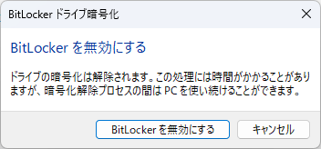 画面真ん中くらいにある「BitLockerを無効にする」をクリックすると解除が始まる…、かと思いきや、もう1ステップ。