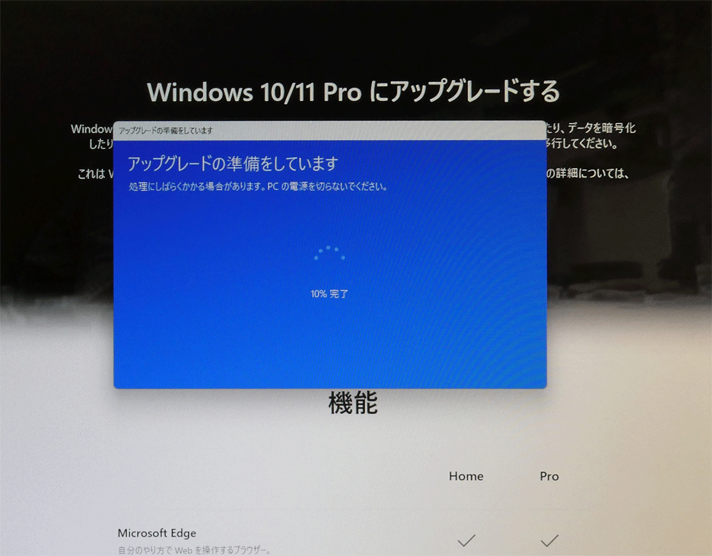 Windows10から11へのアップグレード等と比べると、あっという間です。月例更新とまでは言いませんが、24H2から25H2へのアップデート等と同じくらいの感じでしょうか。