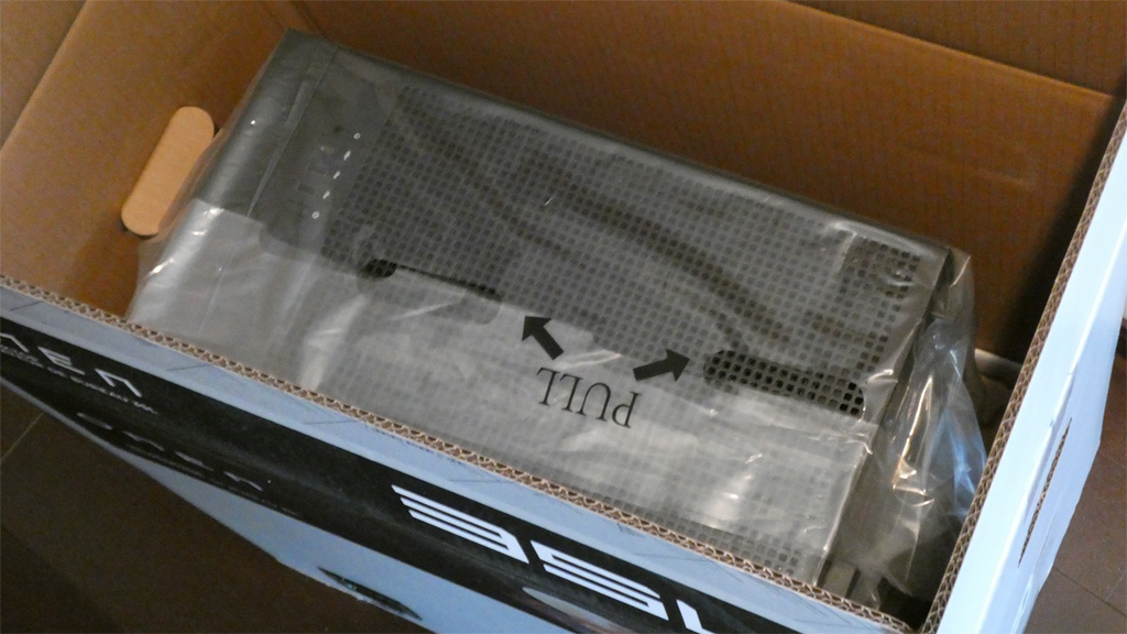 それはさておき、ビニル袋に収められた本体が見えてきます。ビニル袋の持ち手を引き上げて、箱から本体を抜き出すんですが、これ、不安になりますよね。本体の重みのテンションがかかった瞬間に、ビニル袋の持ち手が伸びていく感覚があります。この15kgに、本当に耐えられるんだろうか、と。