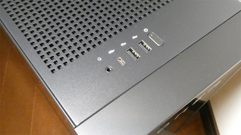 天板の手前にある外部インターフェイスは、USB Type-C 10Gbpsが1つと、Type-A 5Gbpsが2つ。それと、ヘッドフォン出力/マイク入力のコンボポートが1つです。電源スイッチもここにあります。