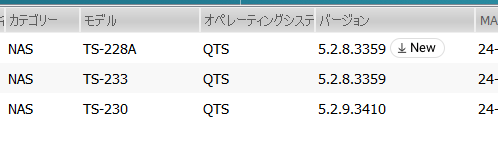 前回の5.2.7.3297から、3台のNASを手動で5.2.8.3359にアップデートしていたんですが、そのうちの1台、TS-228Aに、「↓New」のマークが付いています。