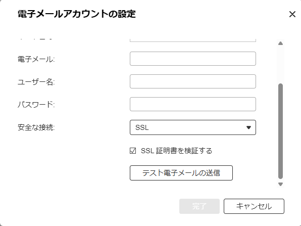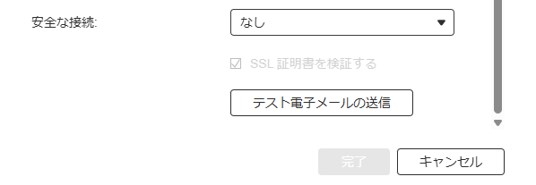 確かに、変わってます。安全な接続のデフォルトが「SSL」に変わってますね。といっても、「なし」も選択可能で、「なし」にすると、SSL証明書を検証するのチェックボックスは設定不可のグレー表示となります。