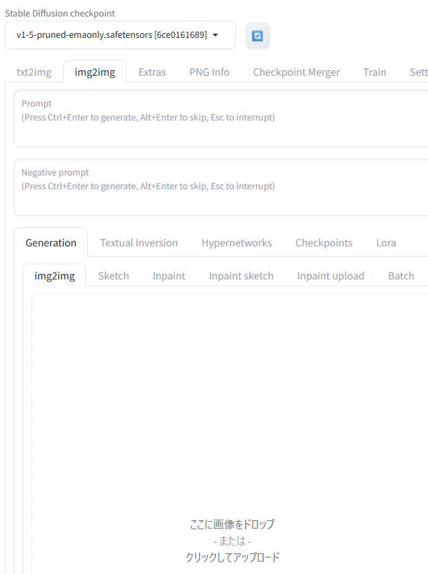 下には、Generationとあって、その中に、img2imgタブがあるんですが、ここに画像をドロップという枠があるので、そこに、元画像をドロップし、Promptに、変更したい内容を文字で記載します。