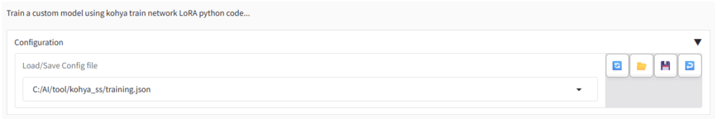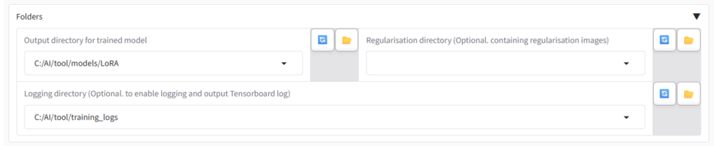 その下にある項目 Output directory for trained model には、生成したLoRAファイルを格納する用のフォルダを指定します。事前に作成しておいてください。