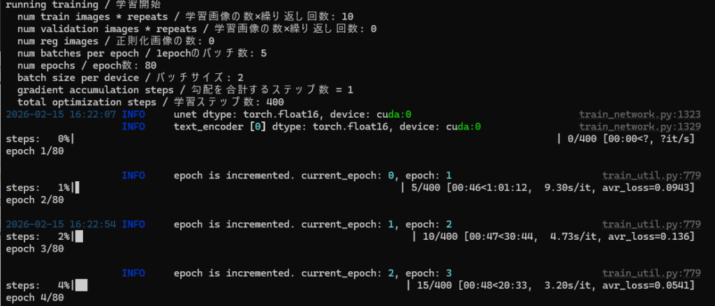 Train batch sizeは、VRAM16GBの5070Tiなら、2で大丈夫かと思います。実はもうちょっと高い値でも学習可能なんですが、一説には並行して学習を行うよりもbatchが低めの方が安定する(画像差分を認識しやすい)、という話もあるようで、2としています。