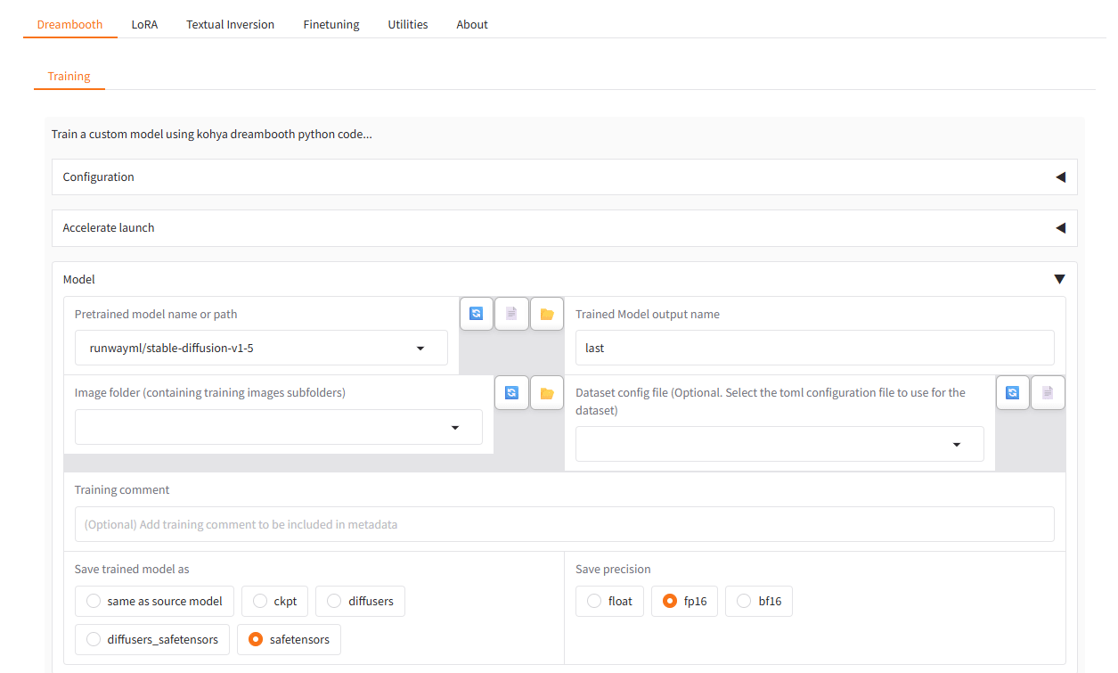 その下にある項目 Output directory for trained model には、生成したLoRAファイルを格納する用のフォルダを指定します。事前に作成しておいてください。