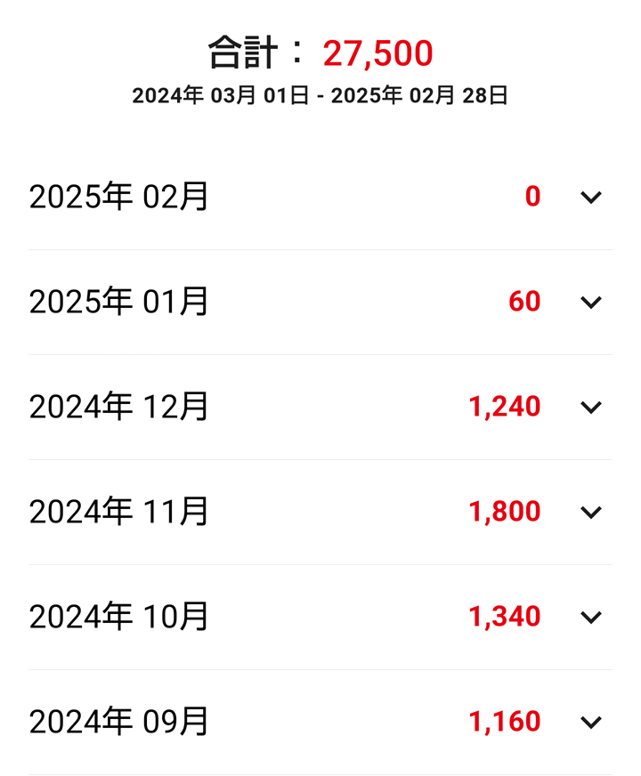 2025年1月から歩くのをやめたのではなく、2025年1月6日の60ptで年間上限に達してしまい、そこから2月末まで、ポイントが付かなくなりました。